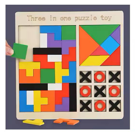 3 in 1 Wooden Jigsaw Puzzle – এক বোর্ডে ৩ ধরনের ধাঁধা গেম: রঙিন ব্লক পাজল, ট্যাংগ্রাম ও টিক-ট্যাক-টো।