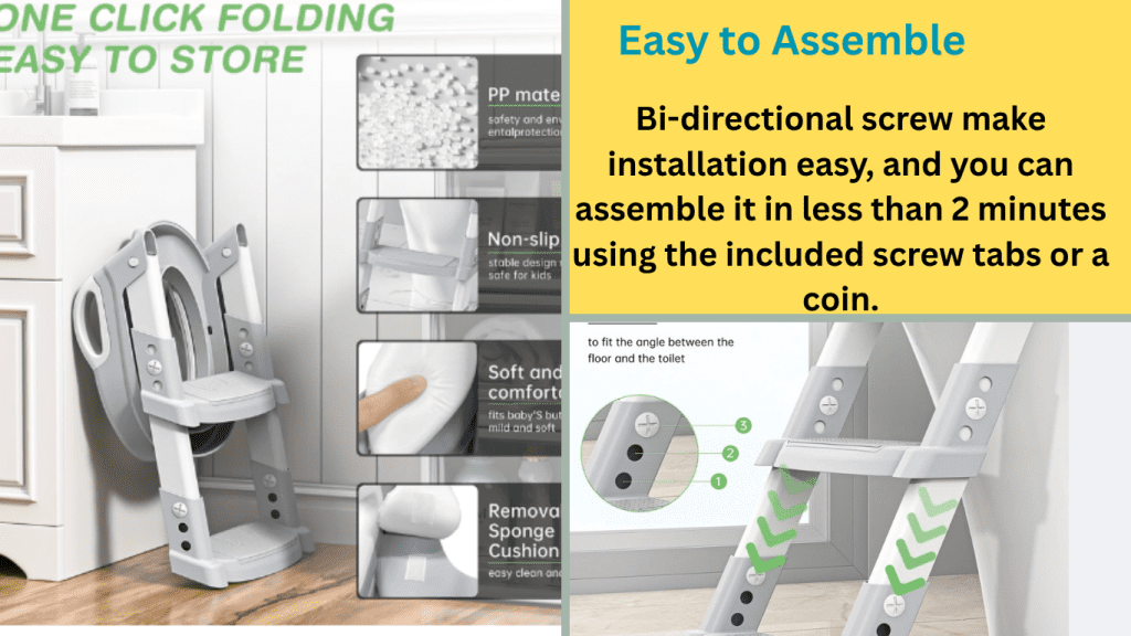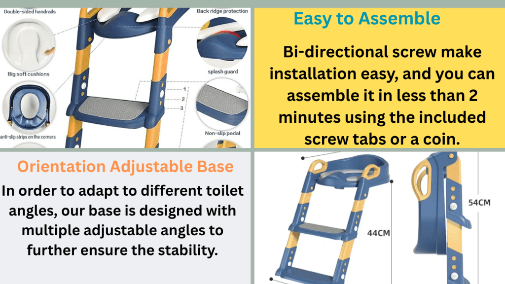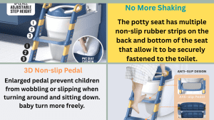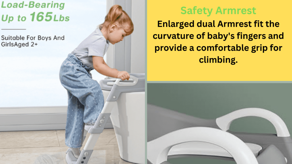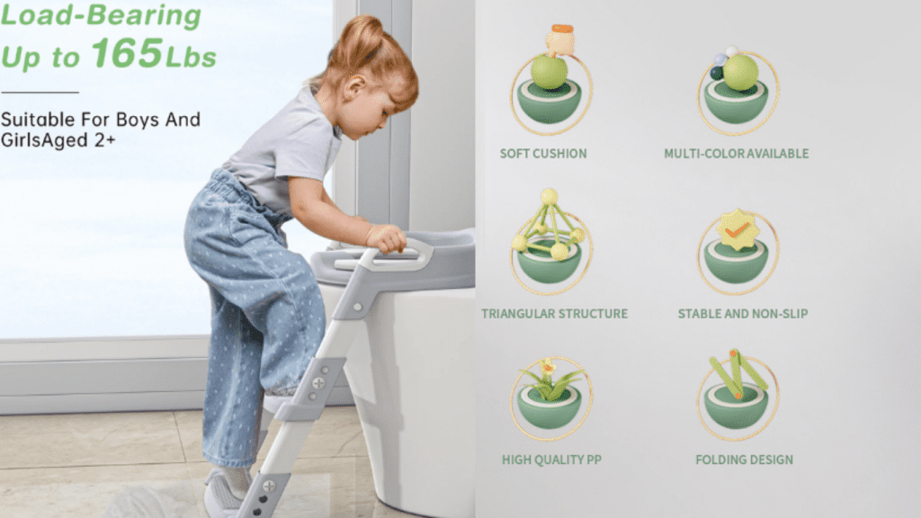 স্টেপ ও হ্যান্ডেল শিশুকে নিরাপদে ওঠানামা করতে সাহায্য করে। সিটটি নরম, অ্যান্টি-স্লিপ, এবং সহজে ব্যবহারযোগ্য – ফলে শিশুরা ভয় না পেয়ে সহজেই ব্যবহার করতে পারে।